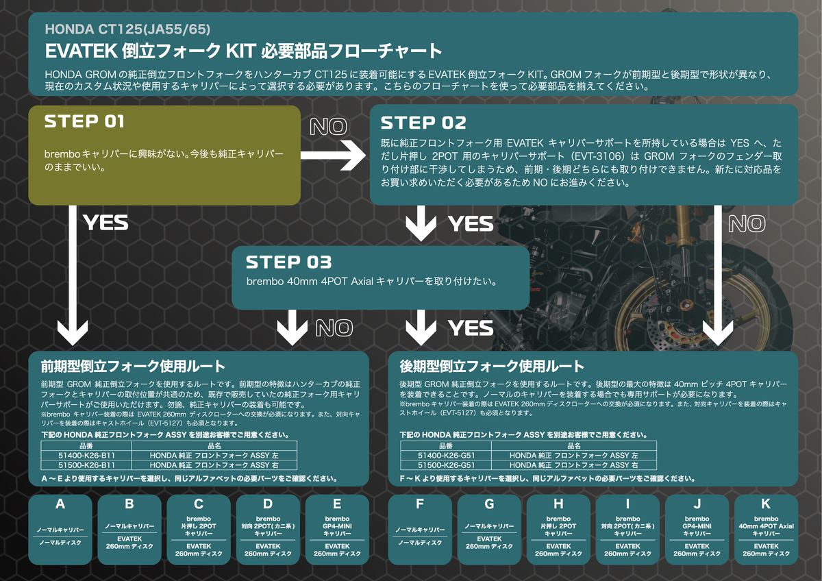 また上記のようにGROMのフロントフォークが前期型と後期型に分かれており、車両の状態や、カスタムするキャリパーなどに応じて選択する必要がございます。