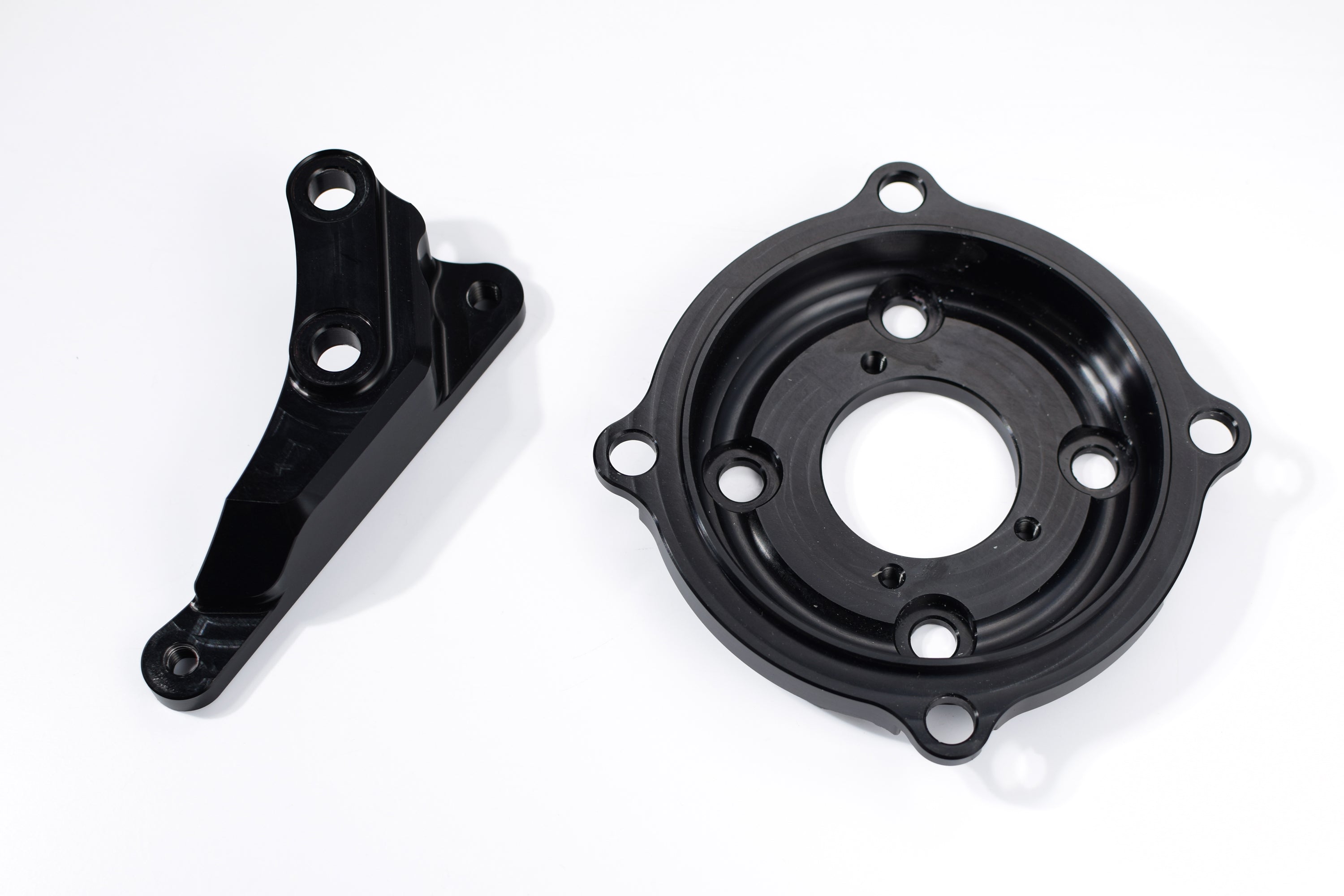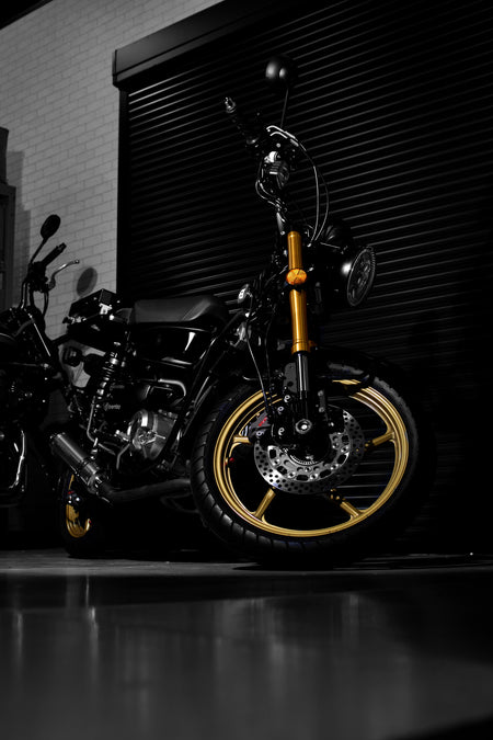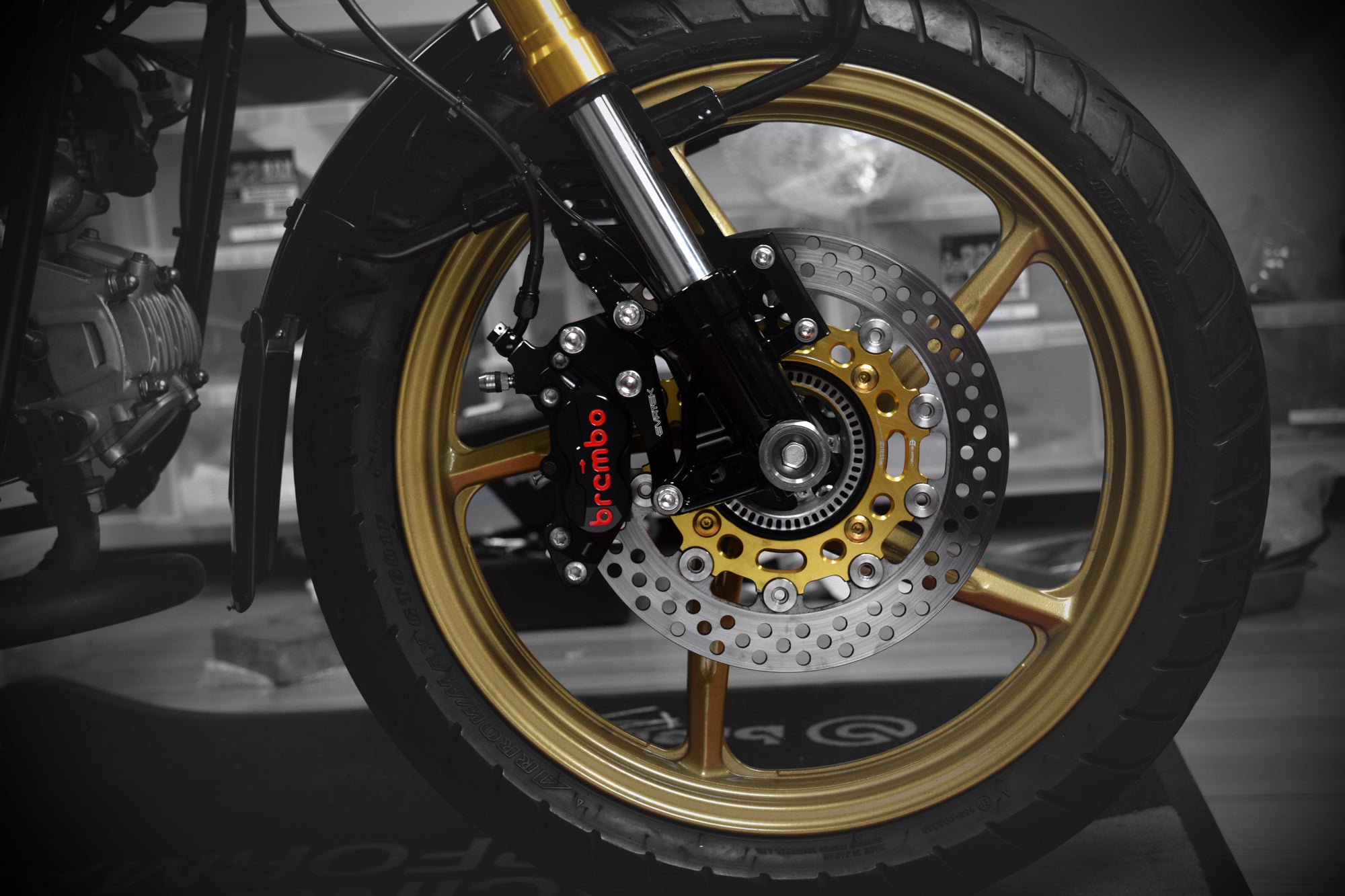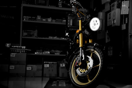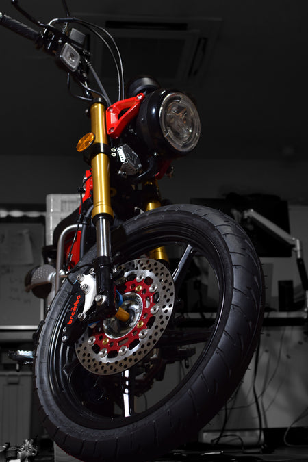EVATEKのハンターカブ用 倒立フロントフォークキットは、HONDA GROMの純正倒立フォークをハンターカブに装着可能にし、純正はもちろん、260mmディスクやブレンボキャリパーの取り付けも可能にします。