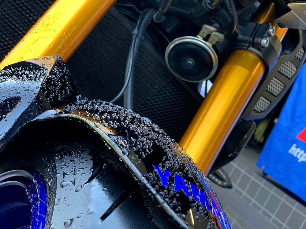 ①車(バイク)を水で良く洗い、ボディ全体をウエットな状態にします。